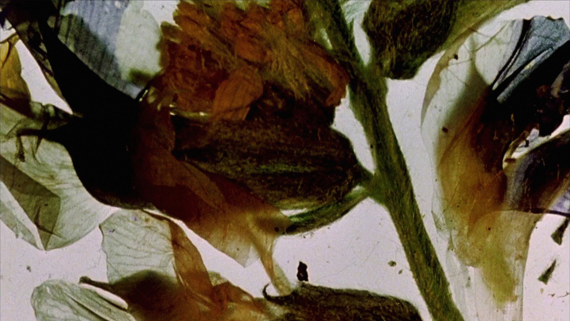 A collage of two-dimensional images of vegetation, each appearing only for a moment, sometimes as a single image, more often with other bits of stem, leaf, bud, or petal. Often we see only the outline of objects against a black background. Black and green are occasionally joined by fragments of orange or of white and blue. The objects in the frame don't move but they are quickly replaced by another collage, giving the feel of rapid motion. Each collage is crisp, its lines etched against the background of black and later of white. Whitman anyone, or Hieronymus Bosch? Although there is no soundtrack, the rapidity of changing images and colors suggests a riot.